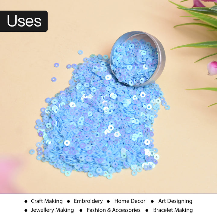 • Product Details:- The sequins base color is Blue Light. It has a rainbow finish because of which the sequins gives a green/purple shade under light