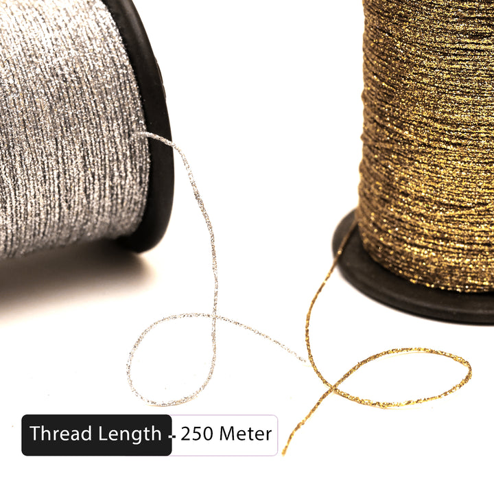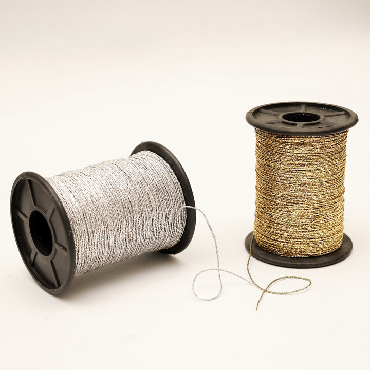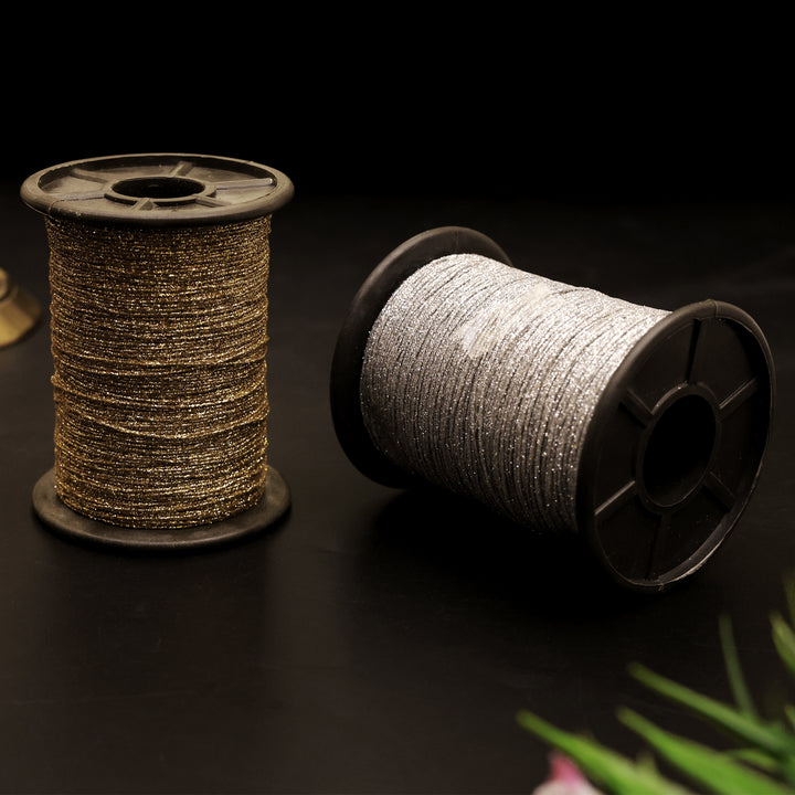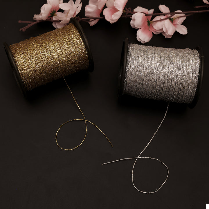 Elevate your crafting and embroidery projects with the Embroidery Material 1 MM Thin Metallic Glitter Dori Thread. This versatile thread, made from premium cotton yarn and polyester glitter, is the perfect addition to any crafting kit. Whether you're working on embroidery, jewelry making, or decorative projects like toran making, this non-elastic glitter dori offers the strength and shine needed to make your creations stand out. Each combo pack includes two rolls—one in shimmering gold and the other in radiant silver—providing you with 500 meters of dazzling thread to bring your designs to life. ( Product Code 8142)