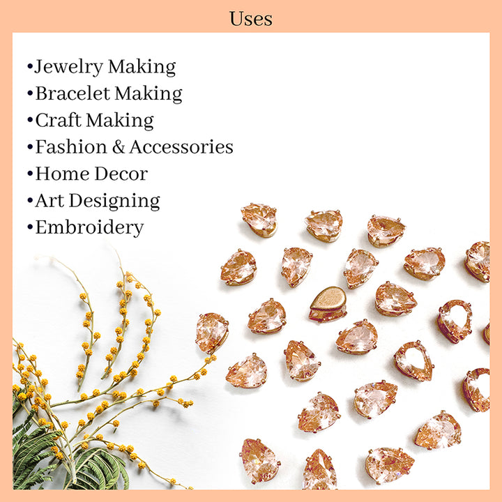 Elevate your crafts, jewelry, and embroidery projects with our exquisite Light Gold Crystal Rhinestones in Golden Metal Back Crown Prong Setting. Crafted from high-quality crystal glass and set in golden brass, these Tear Drop-shaped rhinestones measure 5X7MM each, offering a perfect balance of elegance and versatility.