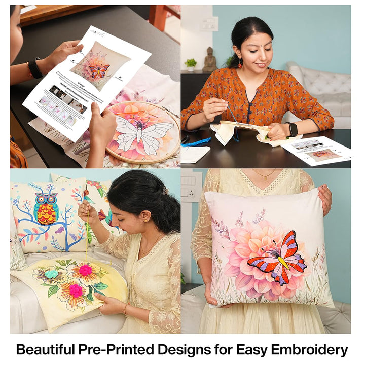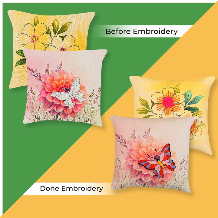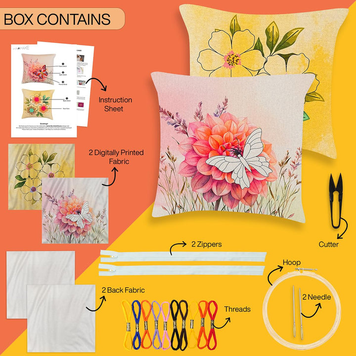Pack of 2 DIY Cushion Cover Hand Embroidery Kit for Beginners & Adults – Butterfly & Bold Blooms | 16"x16" Cross-Stitch Pillow Covers with Digitally Printed Fabric | Complete Kit