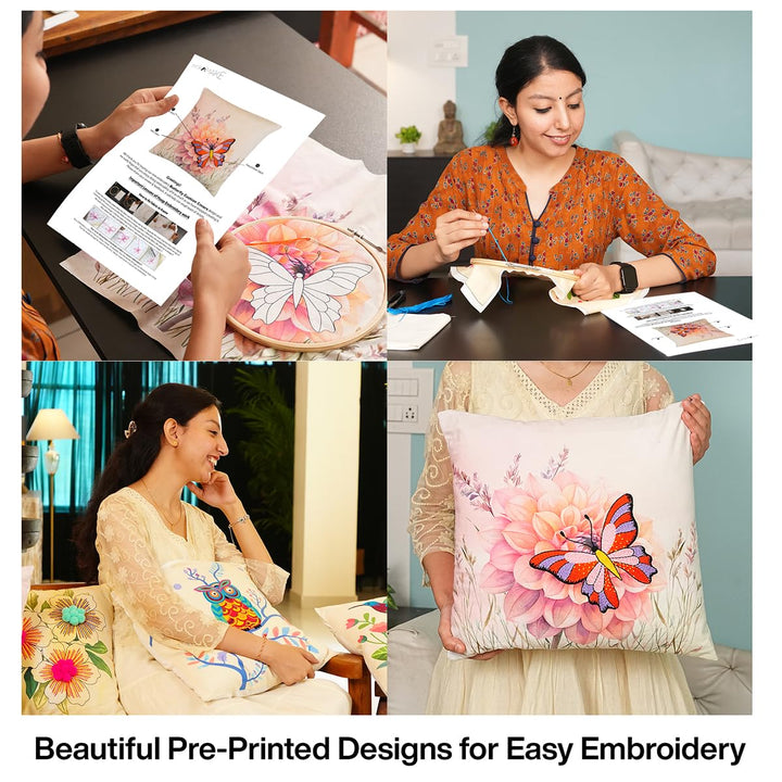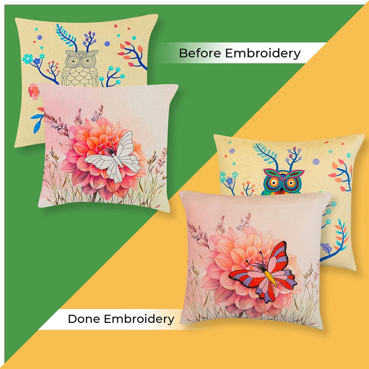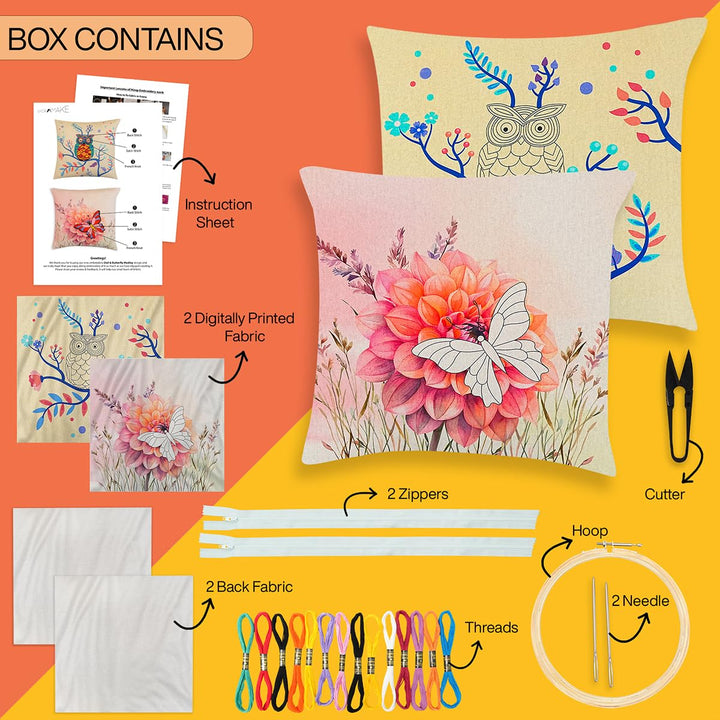 Pack of 2 DIY Cushion Cover Hand Embroidery Kit for Beginners & Adults – Owl & Butterfly Medley | 16"x16" Cross-Stitch Pillow Covers with Digitally Printed Fabric, Threads, Hoop & More