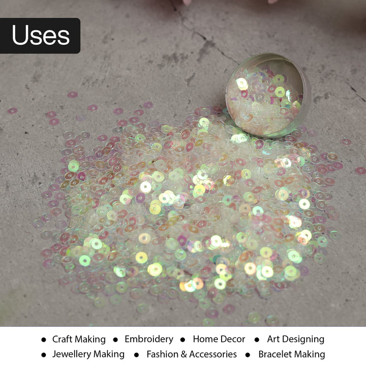 • Product Details:- The sequins has a Crystal finish, which gives a tinge of Purple/Blue shade to the sequins under any kind of light. if you want to highlight any kind of print, then use this sequins over the print and see the magnificent effect.
